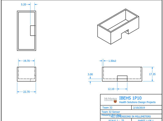 The slideshow (left) showcases the 3-D printed tangible prototype that we designed as well as detailed drawings (ANSI Conventions) of the parts making up our sensor housing. The three components are the frame, arms, and hinge bracket.